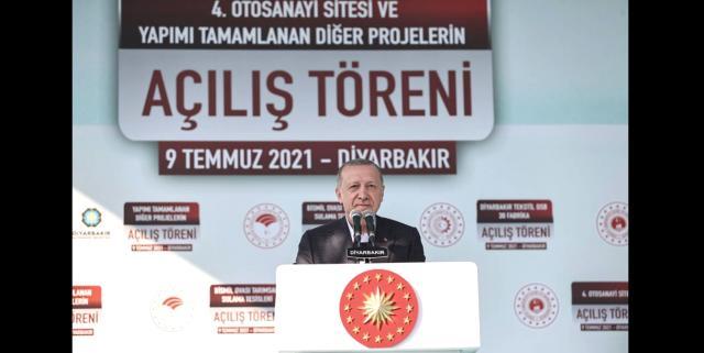 Diyarbakır'ın tarih boyunca hep medeniyet, barış, huzur ve refah şehri olduğunu dile getiren Cumhurbaşkanı Erdoğan, "Bir zamanlar Türkiye'nin ilk 5 sanayi kentinden biri Diyarbakır'dı. Sonra bir karabasan gibi bölgenin ve özellikle Kürt kardeşlerimin üstüne terör felaketi çöktü. Türkiye'nin diğer şehirleri gelişip serpilirken, terör, Diyarbakır'ı sefalete, yoksulluğa, işsizliğe mahkum etti. Şairleri, edipleri, alimleri, tarihi eserleri surlarıyla meşhur güzelim Diyarbakır'ı perişan ettiler. " diye konuştu.