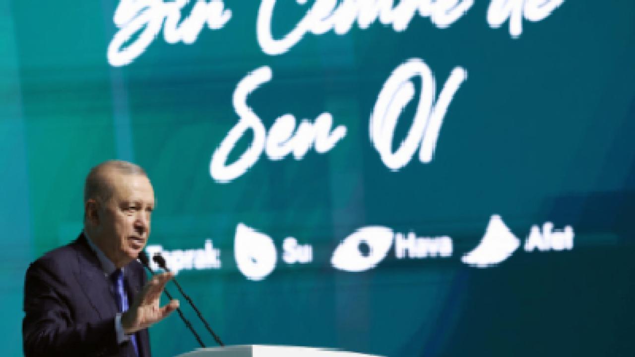 Cumhurbaşkanı Erdoğan, "Bugün tüm dünya, çevre ve iklim meselesinde ciddi sınamaların eşiğinde bulunuyor. Sanayi atıkları, spreyler, dumanlar, petrol ve ilaç atıkları, plastik ürünler, suni gübreler, çöpler, kimyasal atıklar çevremizi çok hızlı biçimde kirletiyor" diye konuştu.