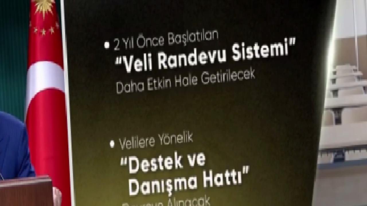 Okul ve veli arasındaki iletişimi güçlendirmek için 2 yıl önce başlattığımız ‘Veli Randevu Sistemini’ daha etkin hale getireceklerini ifade eden Cumhurbaşkanı Erdoğan, "Dijital bağımlılıkla mücadele kapsamında, velilerimize yönelik ‘destek ve danışma hattını’ kısa süre içinde devreye alacağız. Öğretmenlerimize ve okul yöneticilerimize ‘Kriz Yönetimi ve Sınıf İçi Müdahale’ eğitimleri vereceğiz. Öğrencilerimiz için psiko-sosyal destek mekanizmalarını güçlendirecek; ‘Duygu-Değer Temelli Dijital Esenlik’ çalışmalarını yaygınlaştıracağız" diye konuştu.