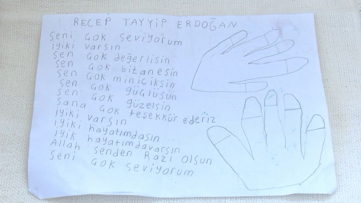 Cumhurbaşkanının geleceğini duyunca şiir yazmaya karar verdiğini belirterek, "Cumhurbaşkanımız şiiri duyunca ağladı ben de 'ağlayacağını bilseydim yazmazdım' dedim. O da bana oyuncak verdi. O ağlayınca üzüldüm. Şiirde seni çok seviyorum, iyi ki varsın, sen çok güzelsin ve çok başarılısın yazdım. O da 'ben de seni çok seviyorum' dedi. Bana bebekler verdi" dedi.