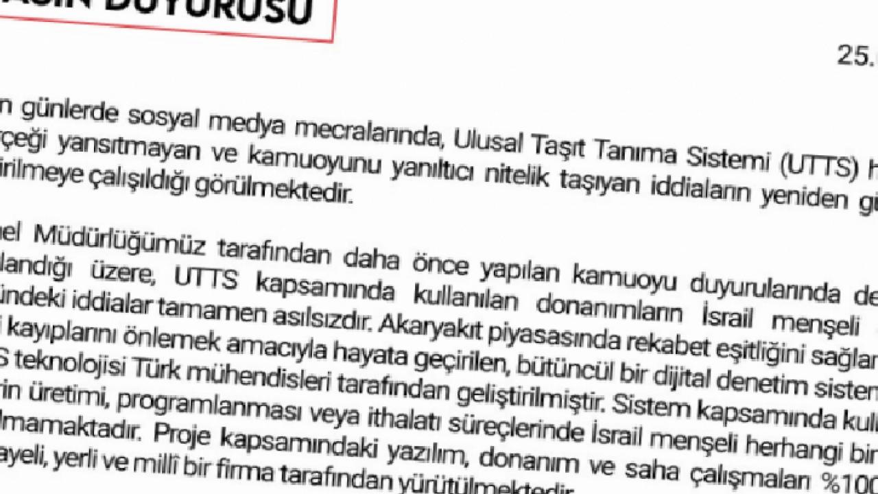 Açıklamada, UTTS kapsamında kullanılan donanımların İsrail menşeli olduğu yönündeki iddiaların tamamen asılsız olduğu vurgulandı. Sistemin, akaryakıt piyasasında rekabet eşitliğini sağlamak ve vergi kayıplarını önlemek amacıyla geliştirildiği belirtilerek, teknolojinin Türk mühendisleri tarafından üretildiği ifade edildi. Sistemde kullanılan çiplerin üretimi, programlanması ve ithalat süreçlerinde İsrail menşeli herhangi bir firmanın yer almadığı kaydedilen açıklamada, yazılım, donanım ve saha çalışmalarının yüzde 100 Türk sermayeli yerli bir firma tarafından yürütüldüğü bildirildi.