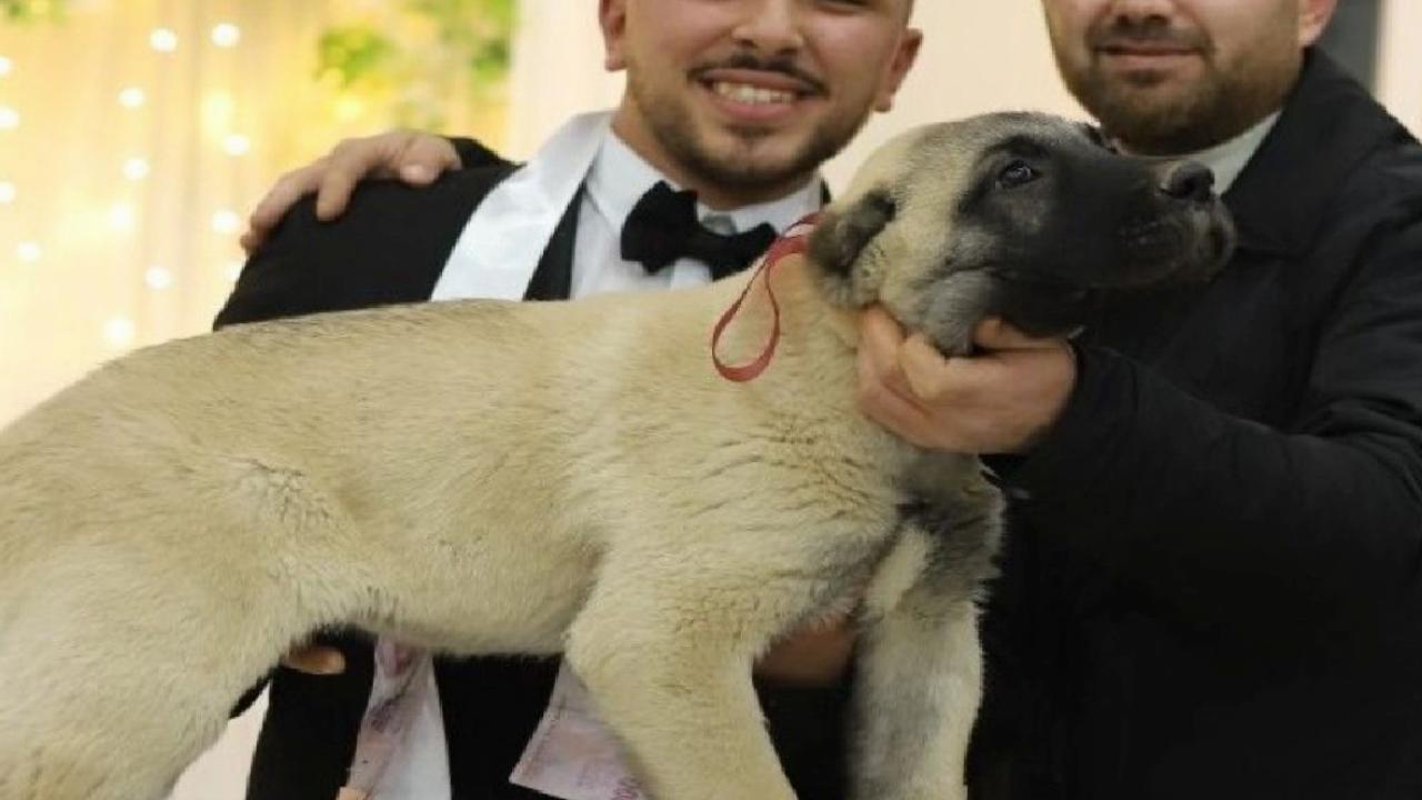 Düğüne katılan davetlilerden Süleyman Gültekin, damada yavru kangal köpeği hediye etti.