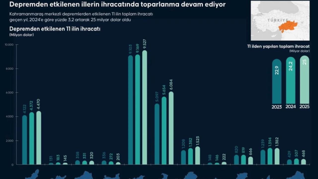 Deprem izlerini silme çalışmalarının devam ettiği 2025'te Kahramanmaraş'ın ihracatı 1 milyar 523 milyon dolar, Osmaniye'nin 1 milyar 382 milyon dolar, Malatya'nın 666 milyon dolar, Şanlıurfa'nın 468 milyon dolar ve Diyarbakır'ın 320 milyon dolar olarak kayıtlara geçti.