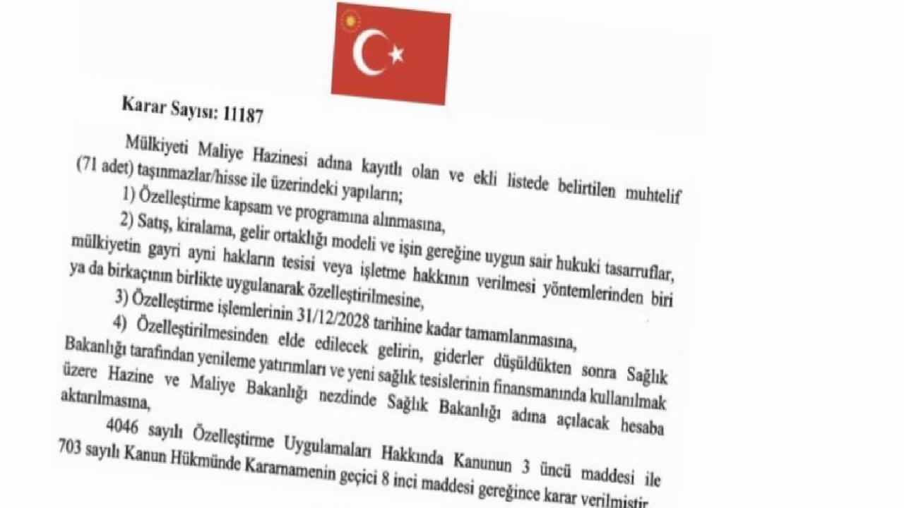 Birlik Sağlık Sen Genel Başkanı Ahmet Doğruyol konu hakkında şu açıklamayı yaptı, “Daha öncede yayınlanmış olan, bazı sağlık kuruluşlarının arazilerinin de yer aldığı kamu arazilerinin satışının ardından bu kez, 24 Nisan 2026 tarih ve 33233 sayılı resmi gazetede yayınlanan, 11187 sayıl karara göre 71 Devlet Hastanesi ve sağlık kuruluşunun arazileri satışa çıkarılmıştır. Karara göre pek çok ilimizde bulunan Maliye Hazinesi adına kayıtlı olan 71 adet taşınmaz ile üzerindeki yapılar özelleştirme kapsamına alınmıştır. Genel olarak il, ilçe merkezlerinde bulunan hastane ve sağlık kuruluşlarının arazileri bulundukları yer ve konuma göre oldukça değerlidir. Yıllardır ifade ettiğimiz gibi, genel itibarıyla yeni yapılan hastanelerin şehir dışına çıkartılarak, şehir merkezlerinde bulunan vatandaşlarımızın kolay ulaşabildiği sağlık kuruluşlarının satılarak gelir elde etme çabası doğru bir yöntem değildir”