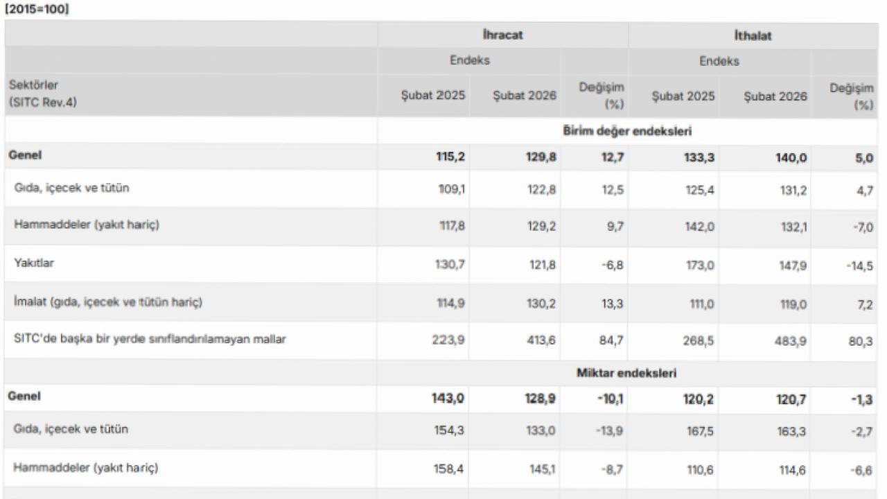 ANKARA () - Türkiye İstatistik Kurumu (TÜİK), Şubat 2026 dönemine ilişkin dış ticaret endekslerini yayımladı.Buna göre, ihracat birim değer endeksi Şubat ayında bir önceki yılın aynı ayına göre yüzde 12,7 arttı. Endeks bir önceki yılın aynı ayına göre gıda, içecek ve tütünde yüzde 12,5 arttı, ham maddelerde (yakıt hariç) yüzde 9,7 arttı, yakıtlarda yüzde 6,8 azaldı, imalat sanayinde (gıda, içecek, tütün hariç) yüzde 13,3 arttı.