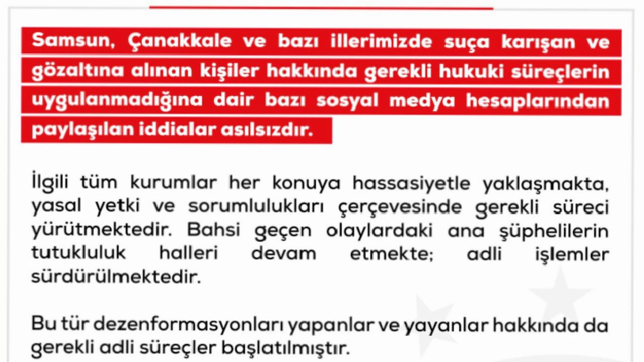ANKARA () - İletişim Başkanlığı Dezenformasyonla Mücadele Merkezi, bazı sosyal medya hesaplarında Samsun, Çanakkale ve diğer illerde gözaltına alınan kişilere yönelik hukuki işlemlerin yapılmadığı yönündeki iddiaların asılsız olduğunu duyurdu.