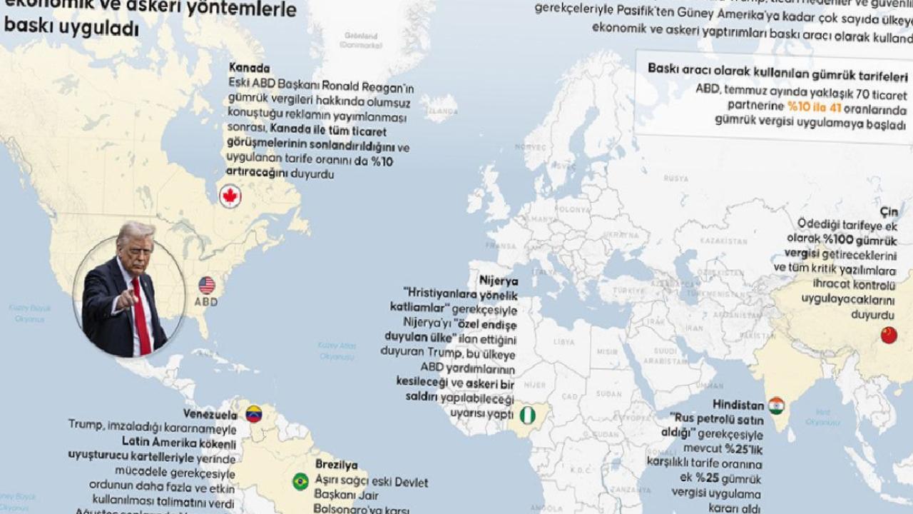 Başta Çin olmak üzere Hindistan, Kanada ve Brezilya gibi çok sayıda ülkeye baskı amaçlı tarifeler uygulayan Trump, son dönemde Venezuela ve Nijerya'ya yönelik askeri saldırı tehditlerinde de bulunuyor.