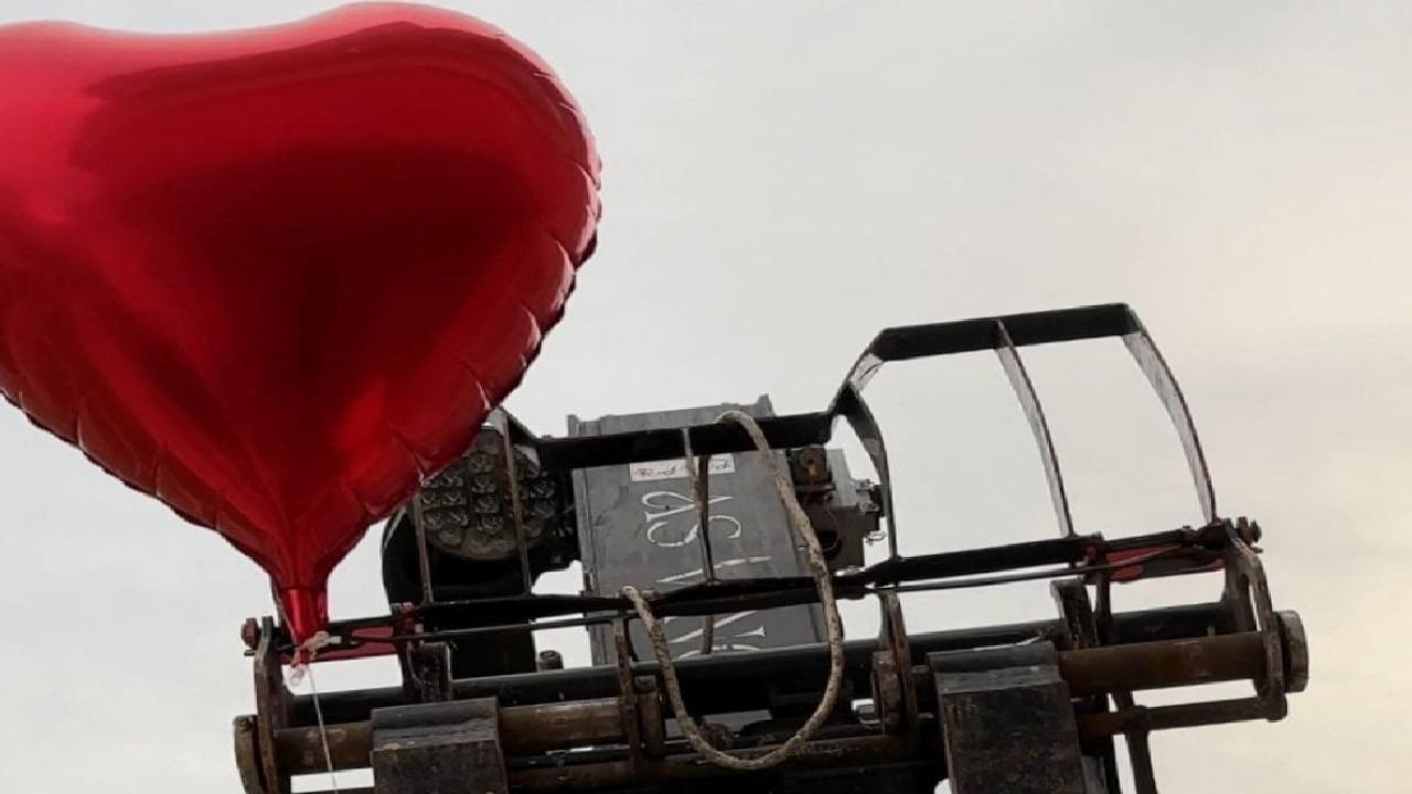 Gül buketi ve kalp şeklindeki balonu makinenin uzayan koluna bağlayan operatör, apartman önüne gelerek sürprizi başlattı.