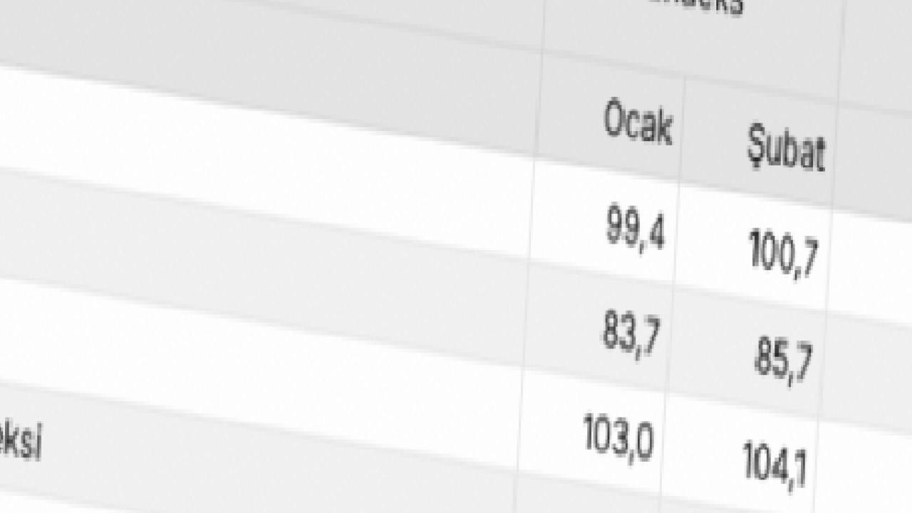 Bir önceki aya göre Şubat ayında tüketici güven endeksi yüzde 2,3 oranında artarak 85,7 değerini, reel kesim (imalat sanayi) güven endeksi yüzde 1,1 oranında artarak 104,1 değerini, hizmet sektörü güven endeksi aynı düzeyde kalarak 113,8 değerini, perakende ticaret sektörü güven endeksi yüzde 2,9 oranında artarak 115,9 değerini, inşaat sektörü güven endeksi yüzde 2,1 oranında azalarak 83,9 değerini aldı.