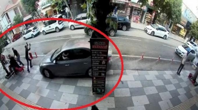 Görüntülerde, otomobilin geldiğini gören yayalar sağa sola kaçışırken, kaçamayacağını anlayan 1 kişinin zıplayıp kaputun üzerine düştüğü yer aldı.