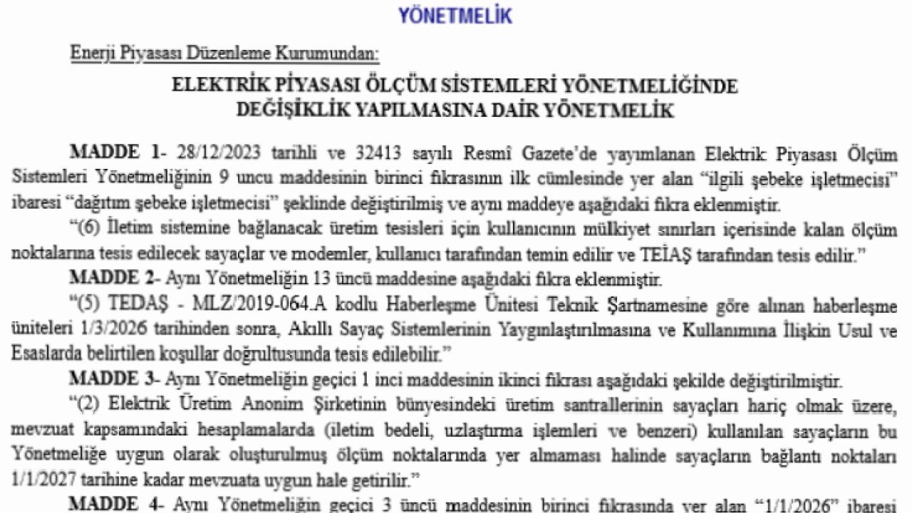 Yönetmelikte ayrıca, TEDAŞ - MLZ/2019-064.A kodlu Haberleşme Ünitesi Teknik Şartnamesi kapsamında alınan haberleşme ünitelerinin, 1 Mart 2026 tarihinden sonra yalnızca Akıllı Sayaç Sistemlerine ilişkin usul ve esaslarda belirtilen koşullara uygun olarak tesis edilebileceği belirtildi. Geçici maddelerde yapılan değişiklikle, Elektrik Üretim AŞ’ye ait santrallerin sayaçları hariç olmak üzere, mevzuat kapsamında kullanılan sayaçların bağlantı noktalarının 1 Ocak 2027’ye kadar yönetmeliğe uygun hale getirilmesi zorunlu kılındı. Ayrıca bazı geçiş hükümlerinin yürürlük tarihleri güncellendi.