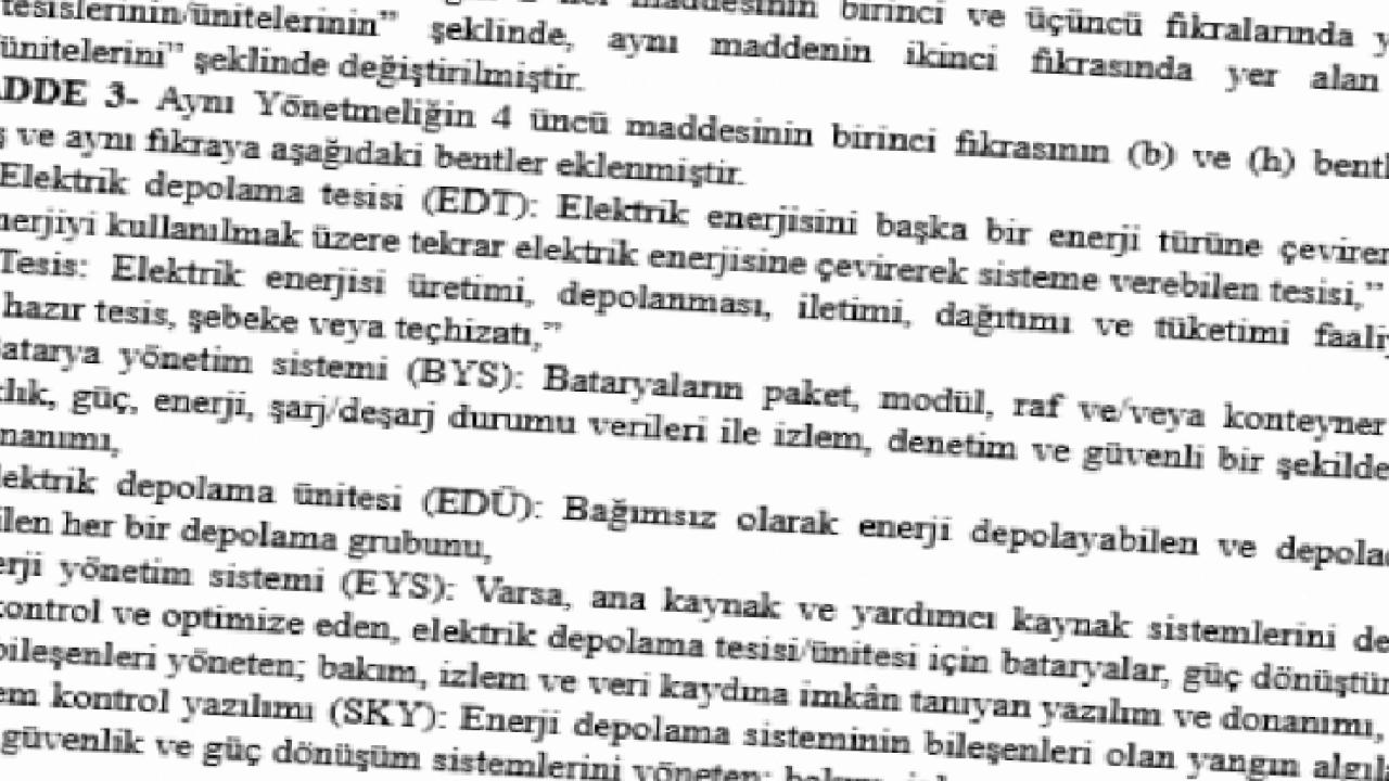Bugünkü Resmi Gazete’de yayımlanan yeni yönetmelikle, “tesis” ibareleri “tesis/ünite” şeklinde genişletildi. Elektrik depolama tesisi ve ünitesi tanımları güncellendi, batarya yönetim sistemi (BYS), enerji yönetim sistemi (EYS) ve sistem kontrol yazılımı (SKY) gibi yeni kavramlar eklendi.