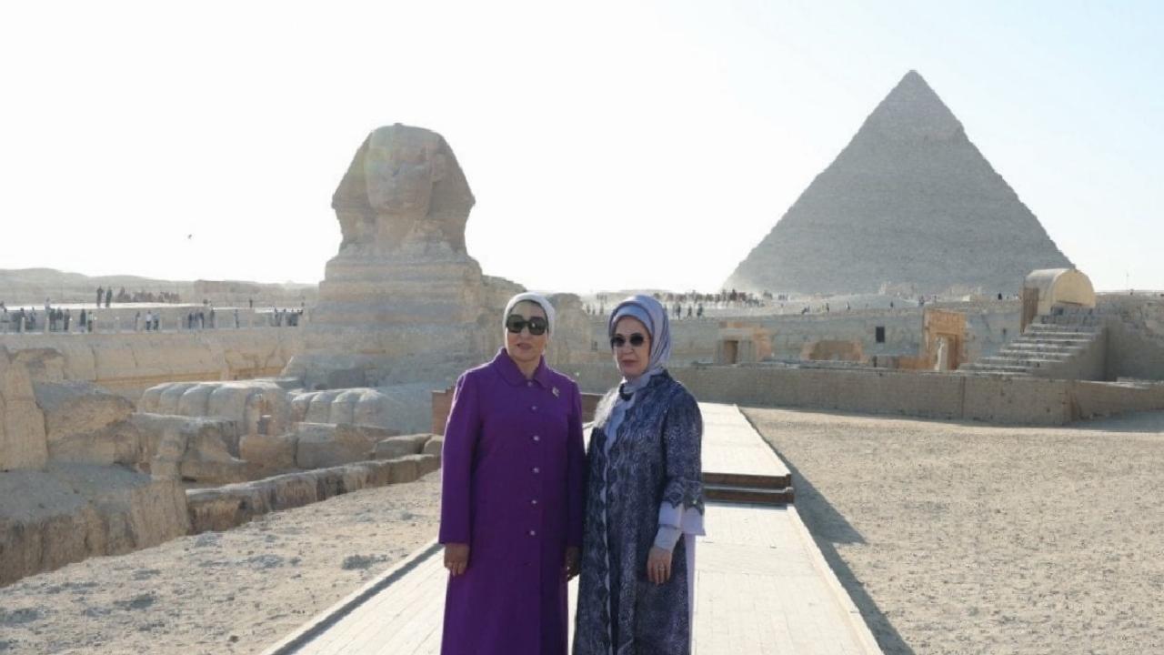 Piramitler hakkında bilgi alan Emine Erdoğan, Entissar Amer ile piramitlerin en eskisi ve en büyüğü olan Keops Piramidi ve Sfenks Heykeli önünde de fotoğraf çektirdi.