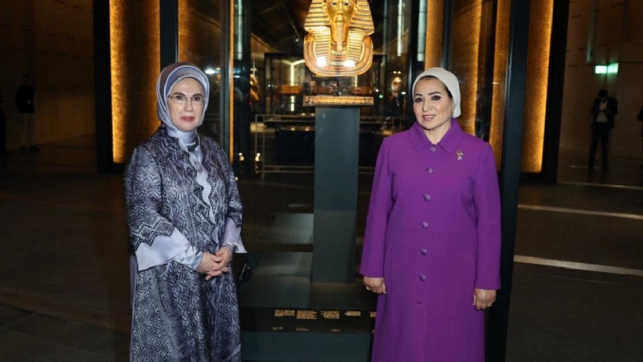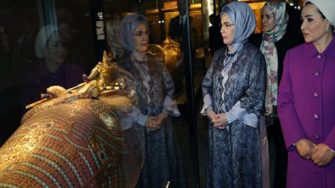 Müzeyi gezen Emine Erdoğan ve Entissar Amer eserler hakkında bilgi aldı. Antik Mısır'da 18. Firavun Hanedanlığı'ndan Kral Tutankamon'un (Tutankhamun) altın ölüm maskesi, mücevherleri, savaş arabaları ve günlük yaşam eşyalarının da yer aldığı koleksiyonu inceleyen lider eşleri, 2. Ramses heykeli önünde hatıra fotoğrafı çektirdi.