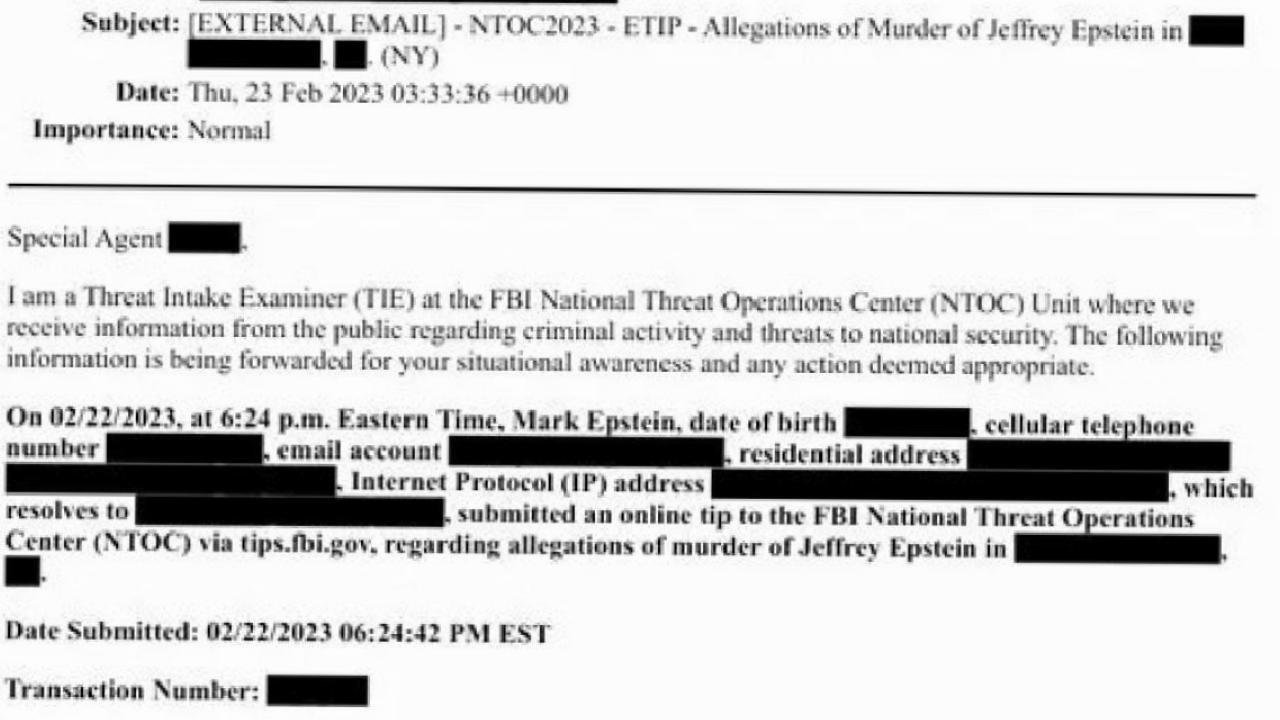 Mark Epstein’in 2023’te FBI’a gönderdiği bir ihbar da bulunuyor.