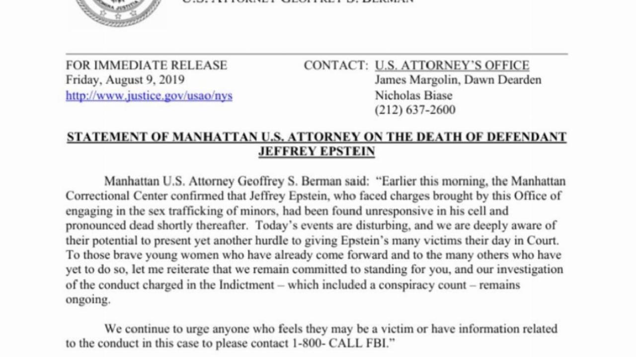 Dosyalarda ayrıca ABD Adalet Bakanlığı tarafından Epstein'in ölümüne dair basın açıklamasının tarihinin 9 Ağustos 2019, yani Epstein'ın açıklanan ölüm tarihinden bir gün öncesine ait olduğu gözlemleniyor.