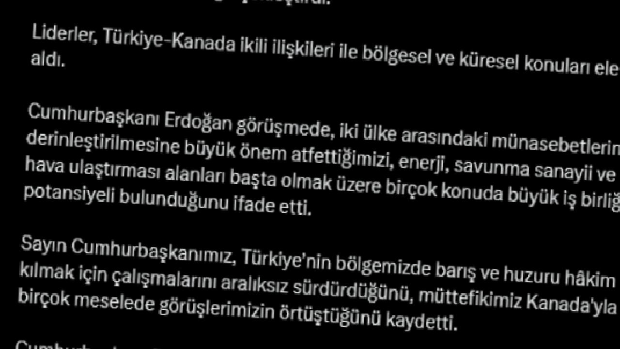 İletişim Başkanlığı'ndan aktarılan görüşmeye göre iki lider, Türkiye-Kanada ilişkilerinin yanı sıra bölgesel ve küresel gelişmeleri değerlendirdi.