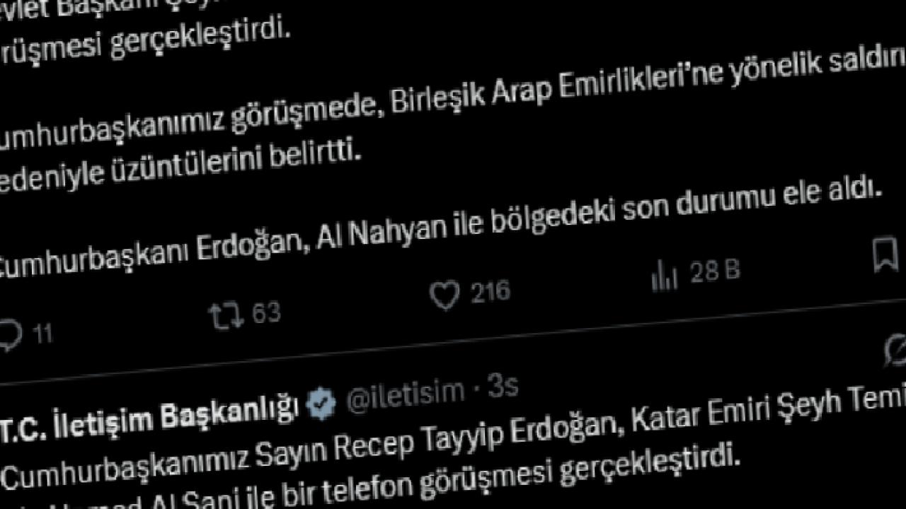 Cumhurbaşkanı Erdoğan ayrıca, Şeyh Muhammed bin Zayed Al Nahyan ile bir telefon görüşmesi gerçekleştirdi. Görüşmede Birleşik Arap Emirlikleri’ne yönelik saldırılar nedeniyle duyulan üzüntü dile getirildi. İki liderin, bölgedeki son gelişmeleri kapsamlı şekilde ele aldığı ve istikrarın sağlanması için temasların sürdürülmesi konusunda mutabık kaldığı kaydedildi.