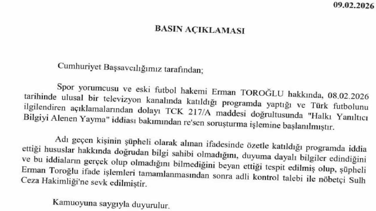 Spor yorumcusu ve eski futbol hakemi Erman TOROĞLU hakkında, 08.02.2026 tarihinde ulusal bir televizyon kanalında katıldığı programda yaptığı ve Türk futbolunu ilgilendiren açıklamalarından dolayı TCK 217/A maddesi doğrultusunda "Halkı Yanıltıcı Bilgiyi Alenen Yayma" iddiası bakımından re'sen soruşturma işlemine başlanılmıştır.