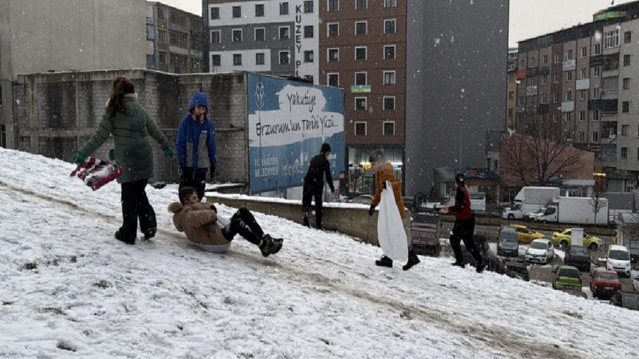 Erzurum’da aralıklarla etkisini sürdüren kar yağışı, özellikle çocuklar için günün en keyifli anlarına dönüştü. Mahalle aralarındaki yamaçlara çıkan çocuklar, karı fırsata çevirdi.