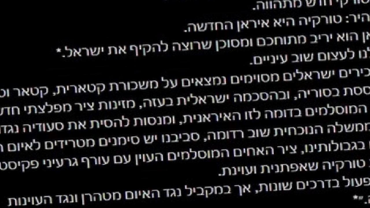 "Bazı İsrailli yetkililer Katar'dan maaş alırken, Katar ve Suriye'de kök salan ve İsrail'in rızasıyla Gazze'de bulunan Türkiye, İran'dakine benzer yeni bir canavarca Müslüman Kardeşler eksenini besliyor ve Suudi Arabistan'ı bize karşı kışkırtmaya çalışıyor."