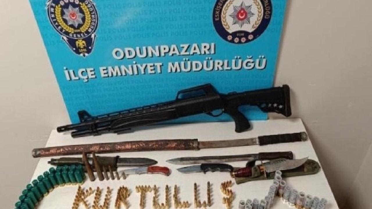 Şahsa ait iş yerinde yapılan aramada 2 adet ruhsatsız tabanca, 1 adet ruhsatsız av tüfeği, 296 adet fişek, 2 adet boş kovan, 2 adet mermi çekirdeği, 5 adet bıçak ve 1 adet kılıç ele geçirildi.
