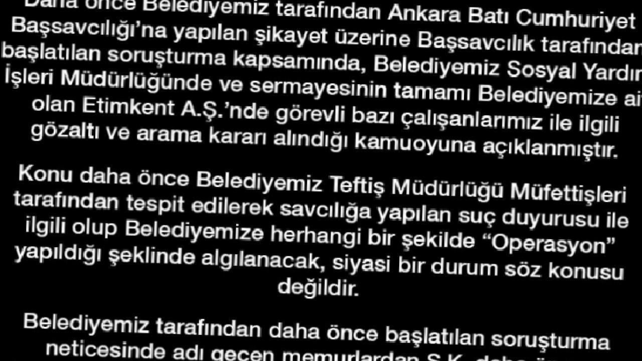 ANKARA () - Etimesgut Belediye Başkanı Erdal Beşikçioğlu, Ankara Batı Cumhuriyet Başsavcılığı tarafından yürütülen soruşturma kapsamında bazı belediye çalışanları hakkında alınan gözaltı ve arama kararlarına ilişkin kamuoyuna açıklamada bulundu.