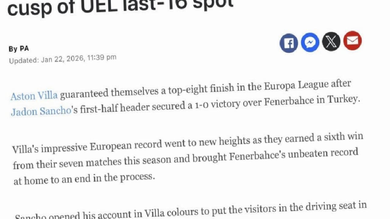 "Sancho Türkiye'de etkileyici bir performans sergiledi. Jadon Sancho, Matty Cash'in seken ortasına yetişerek topu Fenerbahçe kalecisi Ederson'un üzerinden kafa vuruşuyla ağlara gönderdi ve Aston Villa formasıyla ilk golünü kaydetti. İngiliz oyuncu, Morgan Rogers ile birlikte Türkiye'deki düşmanca atmosferde Villa'nın en yaratıcı oyuncusu oldu."