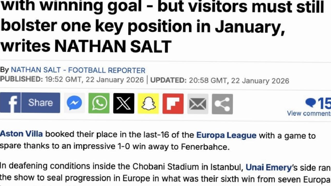 "Jadon Sancho, Aston Villa'yı son 16 turuna yaklaştırdı. Villa'nın etkileyici Avrupa performansı, bu sezon oynadığı yedi maçın altısını kazanarak yeni bir zirveye ulaştı ve Fenerbahçe'nin evindeki yenilmezlik serisine son verdi. Kaleci Marco Bizot, Martinez'in yokluğunda sekiz kurtarış yaparak takımın üstünlüğünü korumasına yardımcı oldu. Gösterdiği çabayla büyük bir sınavdan geçti."