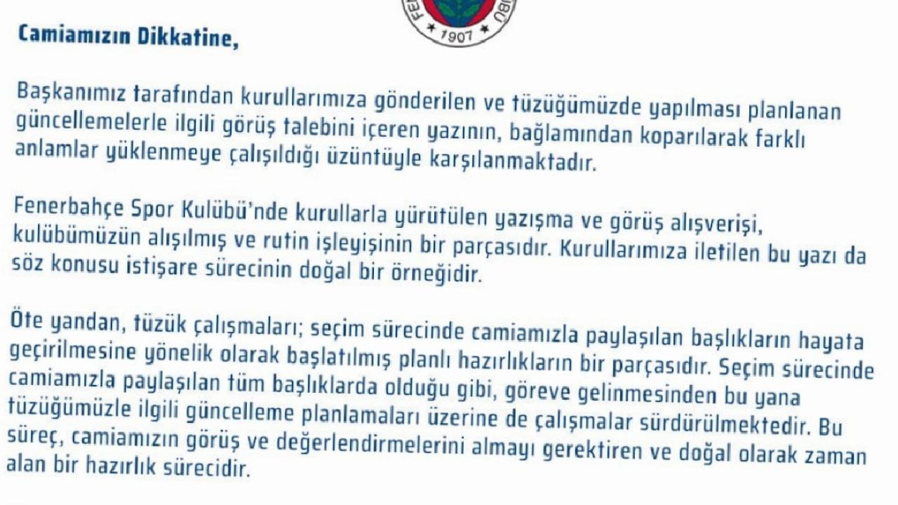 Fenerbahçe Spor Kulübü’nde kurullarla yürütülen yazışma ve görüş alışverişi, kulübümüzün alışılmış ve rutin işleyişinin bir parçasıdır. Kurullarımıza iletilen bu yazı da söz konusu istişare sürecinin doğal bir örneğidir.