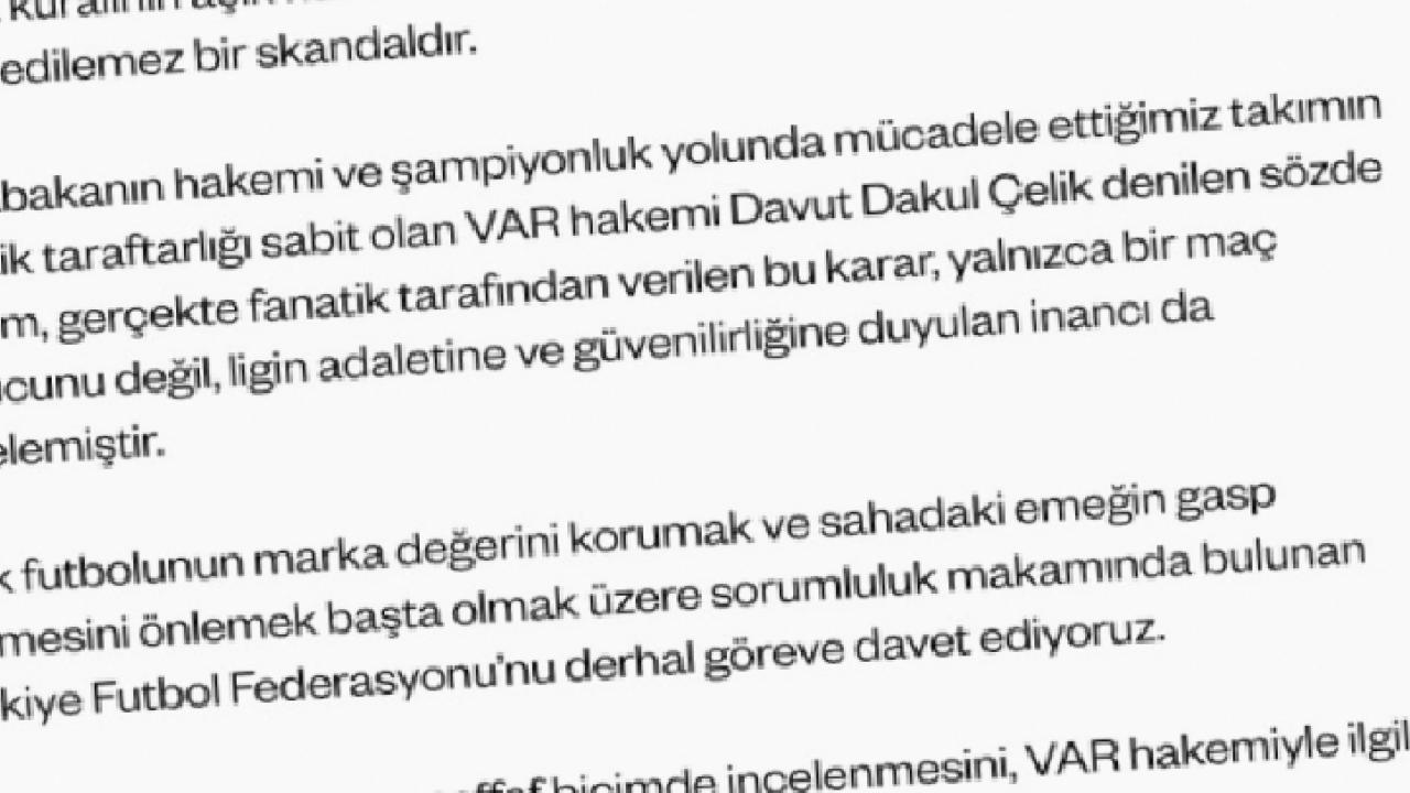 Açıklamada, müsabakanın hakemi ile VAR hakemi olarak görev yapan Davut Dakul Çelik hedef alınarak verilen kararın yalnızca maçın sonucunu değil, ligin adaletine ve güvenilirliğine duyulan inancı da zedelediği ifade edildi.