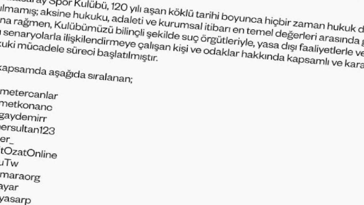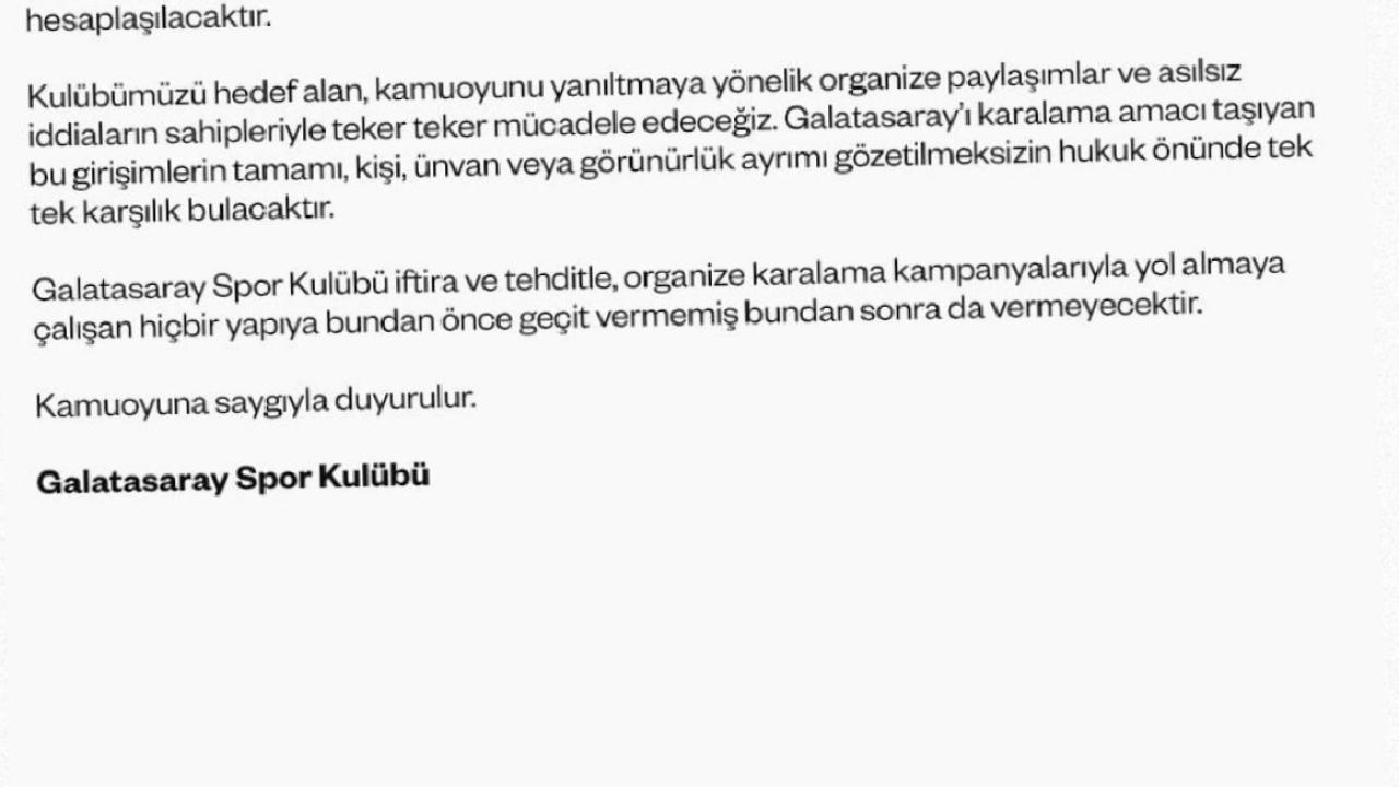 Son dönemde, organize şekilde hareket eden, çeteleşmiş bir ekip tarafından; başta sosyal medya olmak üzere çeşitli mecralarda Galatasaray Spor Kulübü'nün adını yasa dışı süreçlerle ilişkilendirmeye yönelik sistematik bir karalama ve iftira kampanyası yürütüldüğü açıkça görülmektedir.