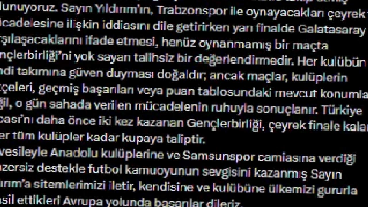 Gençlerbirliği Kulübü, Samsunspor Başkanı Yüksel Yıldırım'ın çeyrek final kura çekiminin ardından yaptığı açıklamaları dikkatle takip ettiklerini belirtti. Yıldırım'ın Trabzonspor ile oynayacakları çeyrek final karşılaşmasını değerlendirirken yarı finalde Galatasaray ile karşılaşacaklarını ifade etmesinin henüz oynanmamış bir maçta Gençlerbirliği'ni yok sayan talihsiz bir değerlendirme olduğu vurgulandı.