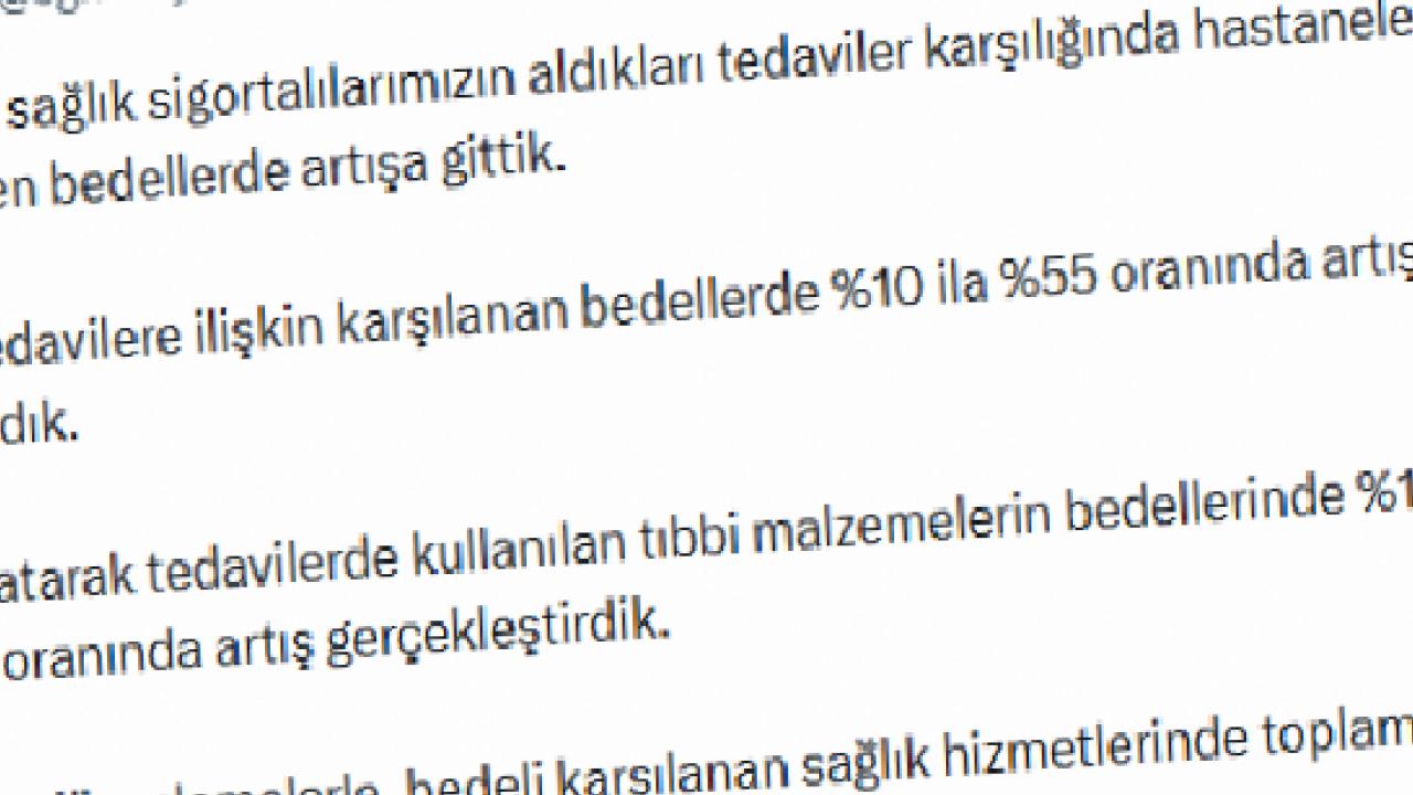 Yoğun bakım tedavi bedellerinde yüzde 55, palyatif bakım tedavi bedellerinde yüzde 40, diyaliz ve kan ürünleri bedellerinde yüzde 35, ayakta tedavi muayene bedellerinde yüzde 30, diğer çeşitli ödenen bedellerde yüzde 10 ila yüzde 30 arasında artış yaptık. Yatarak tedavilerde kullanılan tıbbi malzemeler için ödenen bedellerde yüzde 10-85 aralığında artış sağladık. Milletimizin sağlığı ve refahı için durmadan çalışmaya devam ediyoruz" ifadelerine yer verildi.