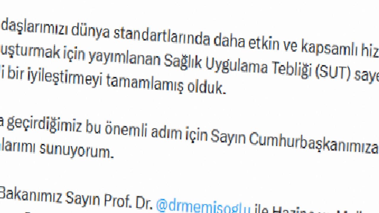 Çalışma ve Sosyal Güvenlik Bakanı Vedat Işıkhan da NSosyal hesabından konuyla ilgili yaptığı paylaşımda şunları kaydetti: "Vatandaşlarımızı dünya standartlarında daha etkin ve kapsamlı hizmetler ile buluşturmak için yayımlanan Sağlık Uygulama Tebliği (SUT) sayesinde önemli bir iyileştirmeyi tamamlamış olduk.