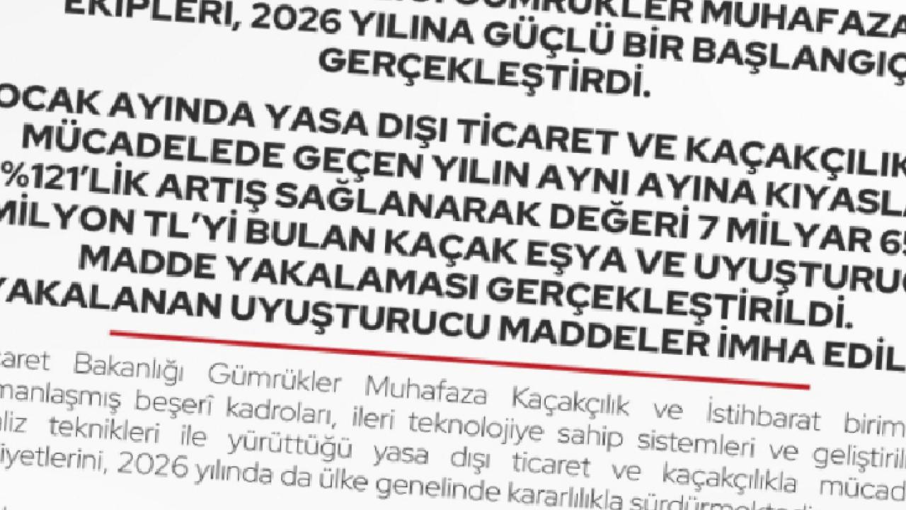 Bakanlıktan yapılan yazılı açıklamaya göre, Ocak ayında gerçekleştirilen operasyonlarda yakalanan kaçak eşya ve uyuşturucu madde değeri 7 milyar 655 milyon TL’ye ulaştı. Bu rakam, 2025’in Ocak ayına göre yüzde 121’lik artışı temsil ederken, ele geçirilen tüm uyuşturucu maddeler imha edildi.