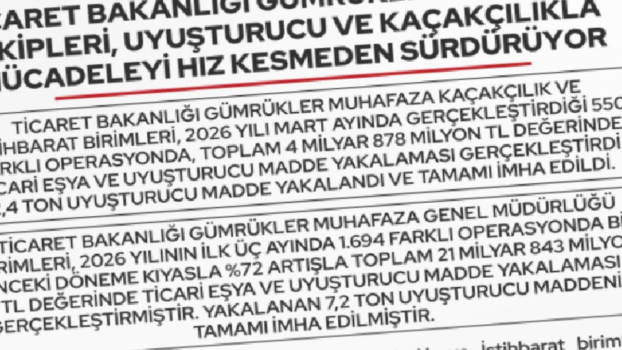 2026 yılının ilk üç ayına ilişkin verilerde ise büyük bir artış yaşandı. Buna göre, 1694 farklı operasyonda toplam 21 milyar 843 milyon TL değerinde kaçak eşya ve uyuşturucu madde ele geçirilirken, bu rakamın geçen yılın aynı dönemine göre yüzde 72 artış gösterdiği bildirildi. Üç aylık dönemde yakalanan 7,2 ton uyuşturucu maddenin tamamının imha edildiği kaydedildi.