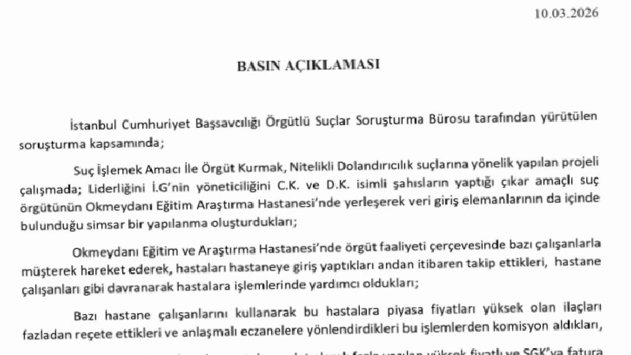 İSTANBUL () - İstanbul Cumhuriyet Başsavcılığı Örgütlü Suçlar Soruşturma Bürosu tarafından “suç işlemek amacıyla örgüt kurmak” ve “nitelikli dolandırıcılık” suçlarına yönelik yürütülen soruşturma kapsamında Okmeydanı Eğitim ve Araştırma Hastanesi merkezli bir suç örgütü deşifre edildi.