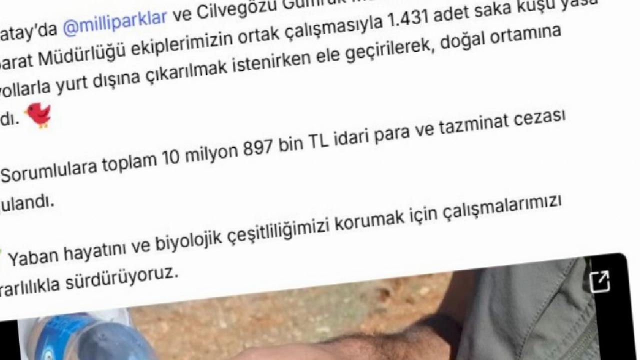 Hatay’da Doğa Koruma ve Milli Parklar Genel Müdürlüğü ve Cilvegözü Gümrük Muhafaza Kaçakçılık ve İstihbarat Müdürlüğü ekiplerimizin ortak çalışmasıyla 1431 adet saka kuşu yasa dışı yollarla yurt dışına çıkarılmak istenirken ele geçirilerek, doğal ortamına salındı. Sorumlulara toplam 10 milyon 897 bin TL idari para ve tazminat cezası uygulandı. Yaban hayatını ve biyolojik çeşitliliğimizi korumak için çalışmalarımızı kararlılıkla sürdürüyoruz.