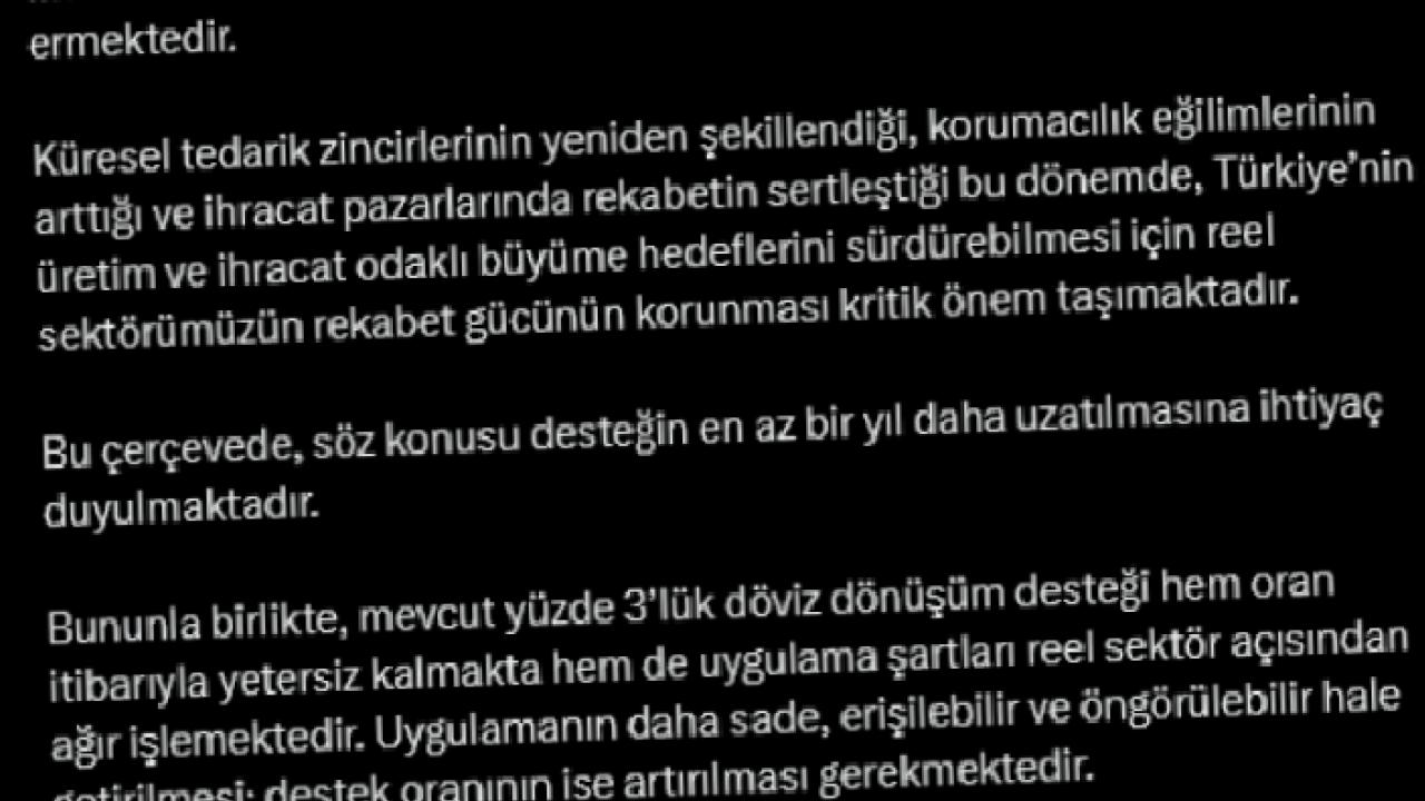 30 Nisan itibarıyla sona erecek uygulamanın mevcut küresel ekonomik koşullar göz önünde bulundurularak yeniden değerlendirilmesi gerektiğini belirten Hisarcıklıoğlu, desteğin uzatılmasının kritik önem taşıdığını ifade etti. Küresel tedarik zincirlerinin yeniden şekillendiğine, korumacılık eğilimlerinin arttığına ve ihracat pazarlarında rekabetin giderek sertleştiğine dikkat çeken Hisarcıklıoğlu, Türkiye’nin üretim ve ihracat odaklı büyüme hedeflerini sürdürebilmesi için reel sektörün desteklenmesi gerektiğini vurguladı.