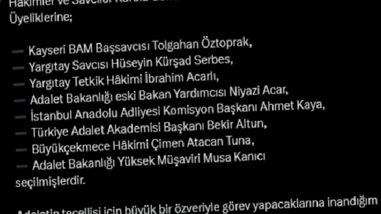 ANKARA () - Adalet Bakanı Akın Gürlek, Hâkimler ve Savcılar Kurulu (HSK) Genel Kurulu toplantısı sonucunda yeni Yargıtay üyelerini duyurdu.