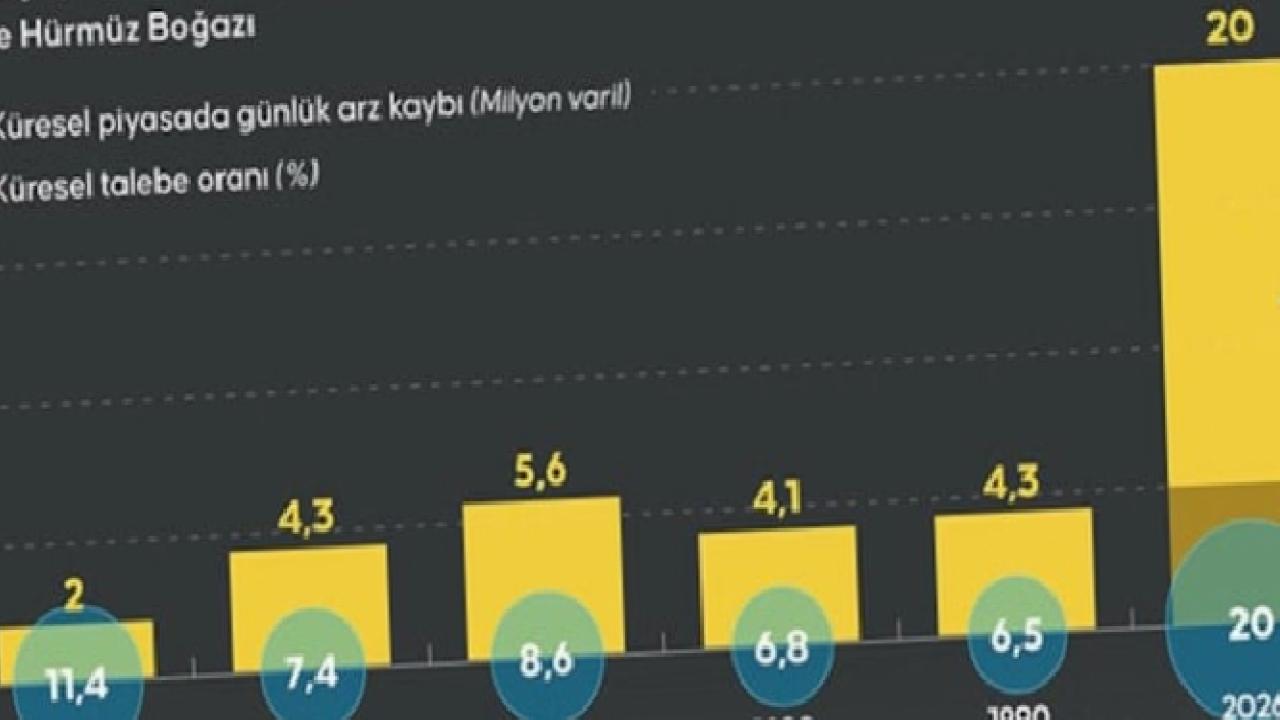 Geçmişte yaşanan başlıca petrol krizleri açısından Hürmüz Boğazı'na bakıldığında 1956 Süveyş Krizinde küresel piyasada günlük arz kaybı 2 milyon varil ve küresel talebe oranı yüzde 11,4 iken, 2026'daki küresel piyasada günlük arz kaybı 20 milyon varil ve küresel talebe oranı yüzde 20 oldu.
