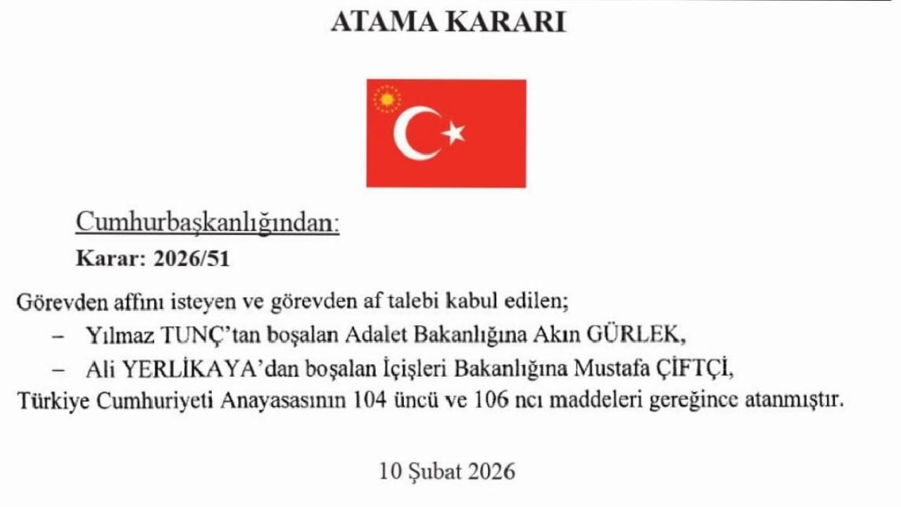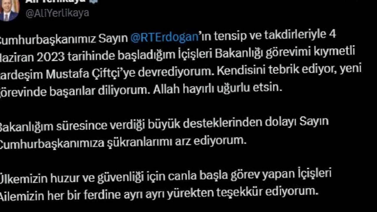Cumhurbaşkanı Recep Tayyip Erdoğan'ın imzasıyla görevden affını isteyen İçişleri Bakanı Ali Yerlikaya'nın yerine Mustafa Çiftçi atadı.
