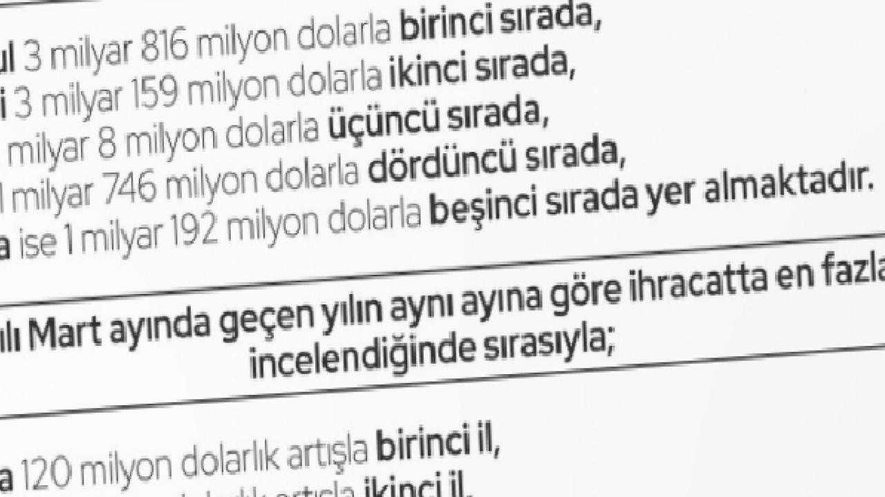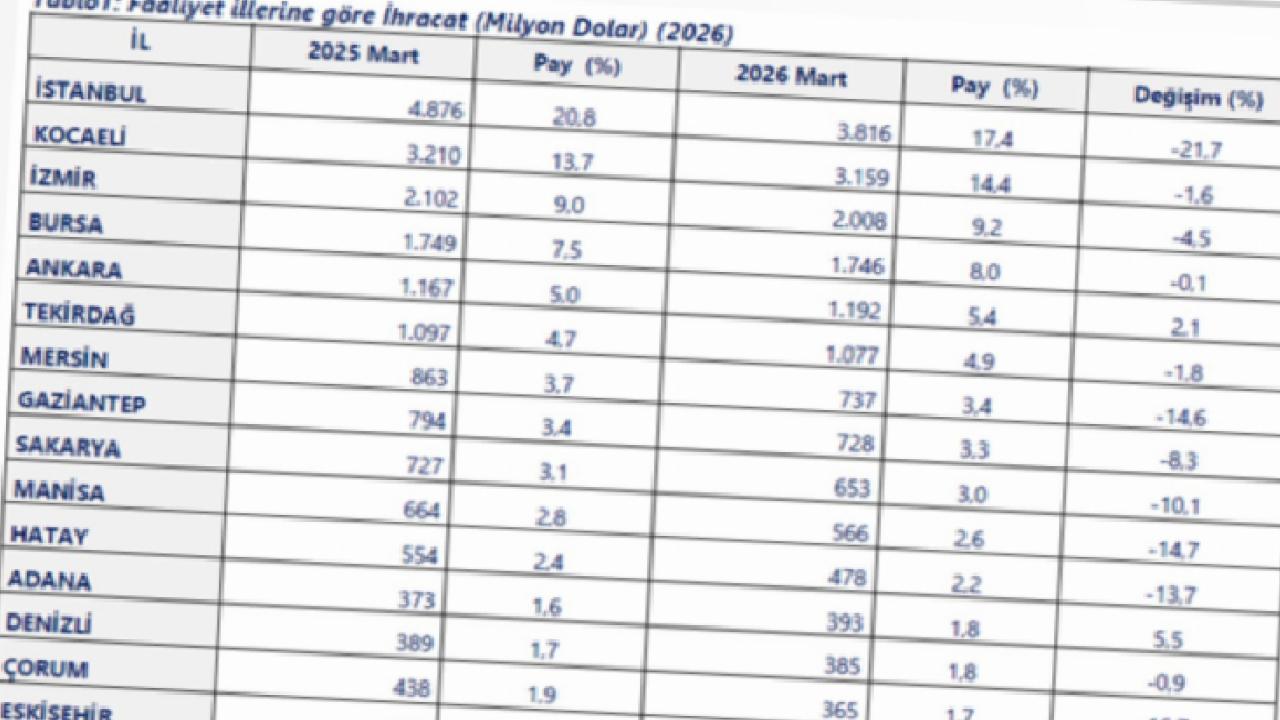 Mart ayı verilerine göre ihracatta liderlik değişmedi. İstanbul 3 milyar 816 milyon dolarlık ihracatla ilk sırada yer alırken, Kocaeli 3 milyar 159 milyon dolarla ikinci, İzmir 2 milyar 8 milyon dolarla üçüncü oldu. Bursa 1 milyar 746 milyon dolarla dördüncü sıraya yerleşirken, Ankara 1 milyar 192 milyon dolarla beşinci sırada yer aldı.