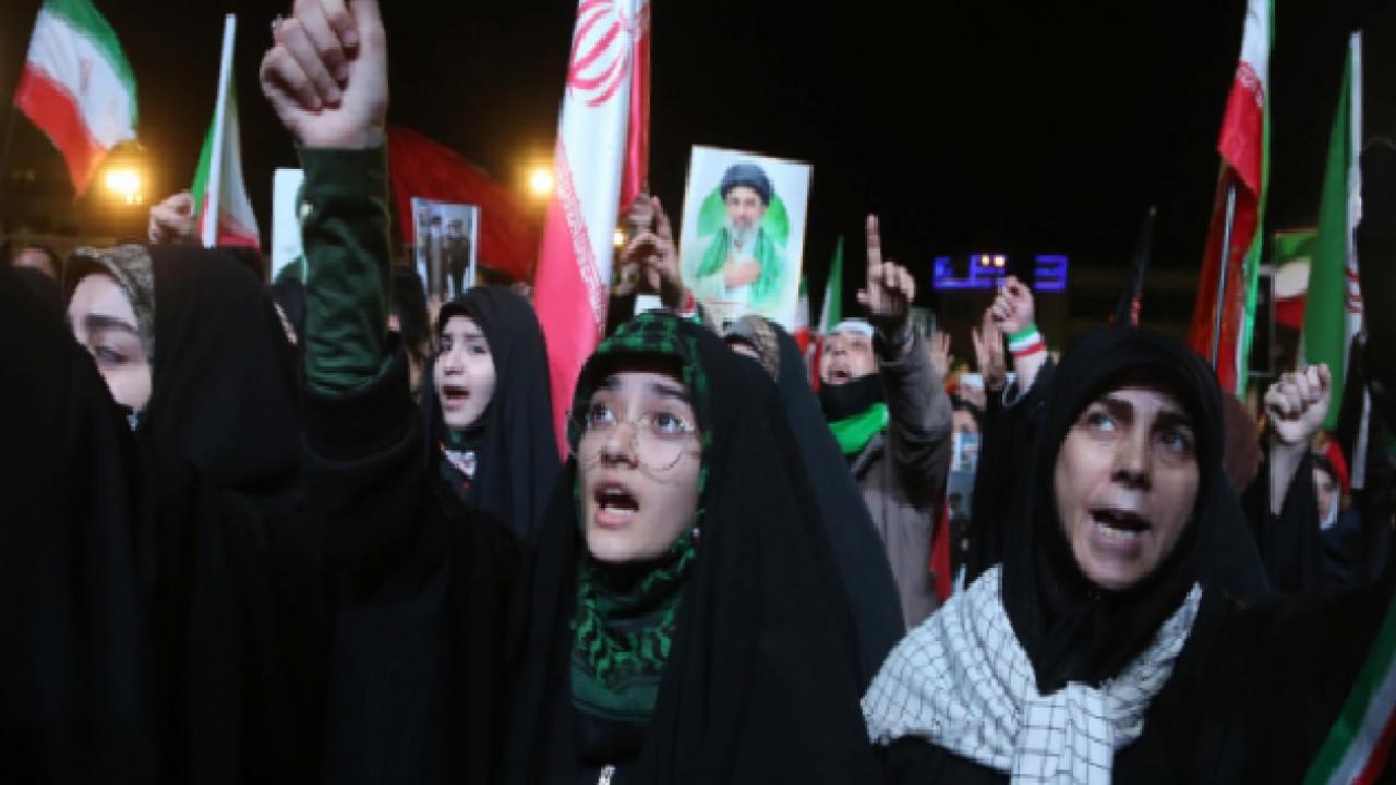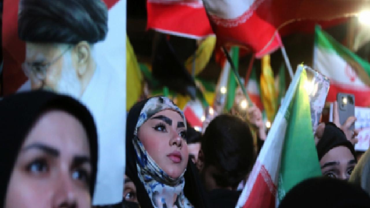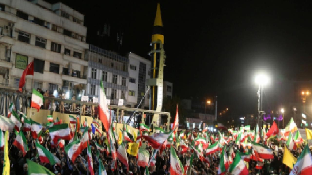 Tahran’da düzenlenen protestolarda binlerce kişi ABD ve İsrail’i hedef alırken, gösteri alanlarına balistik füzelerin getirilmesi dikkat çekti.