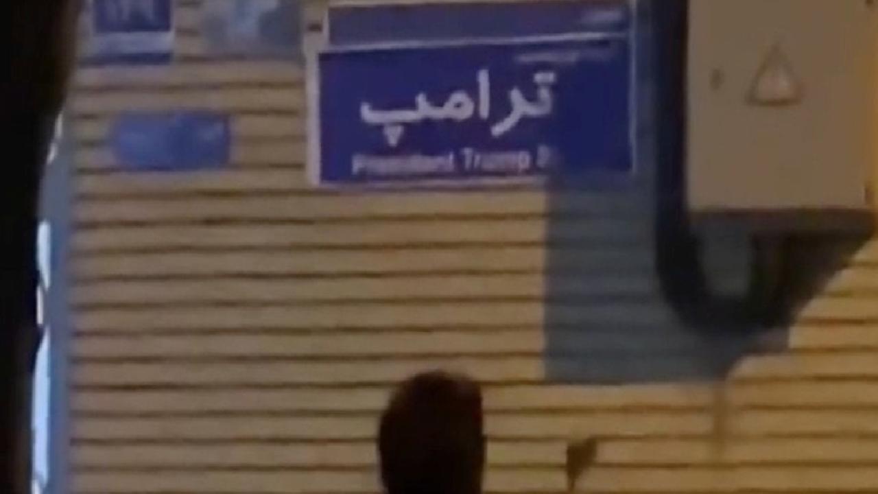 Elinde Farsça ve İngilizce 'Başkan Trump Sokağı' yazan bir afişi orijinal sokak tabelası üzerine yapıştıran göstericinin o anları dikkat çekti.