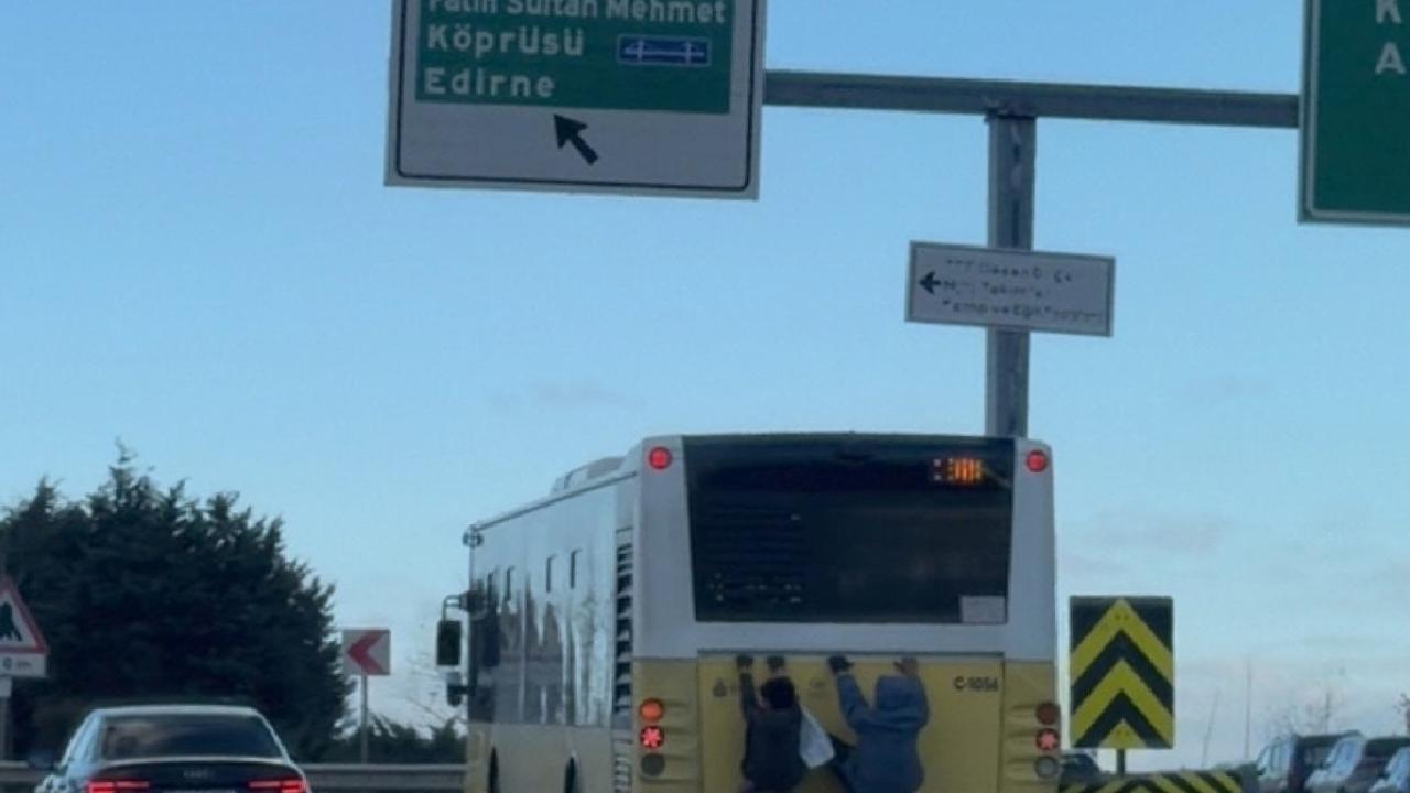 İstanbul'un Beykoz ilçesi Kavacık kavşağında seyir halinde olan İETT otobüsünün bagaj kapağına tutunan 2 çocuk, bir süre bu şekilde yolculuk etti.