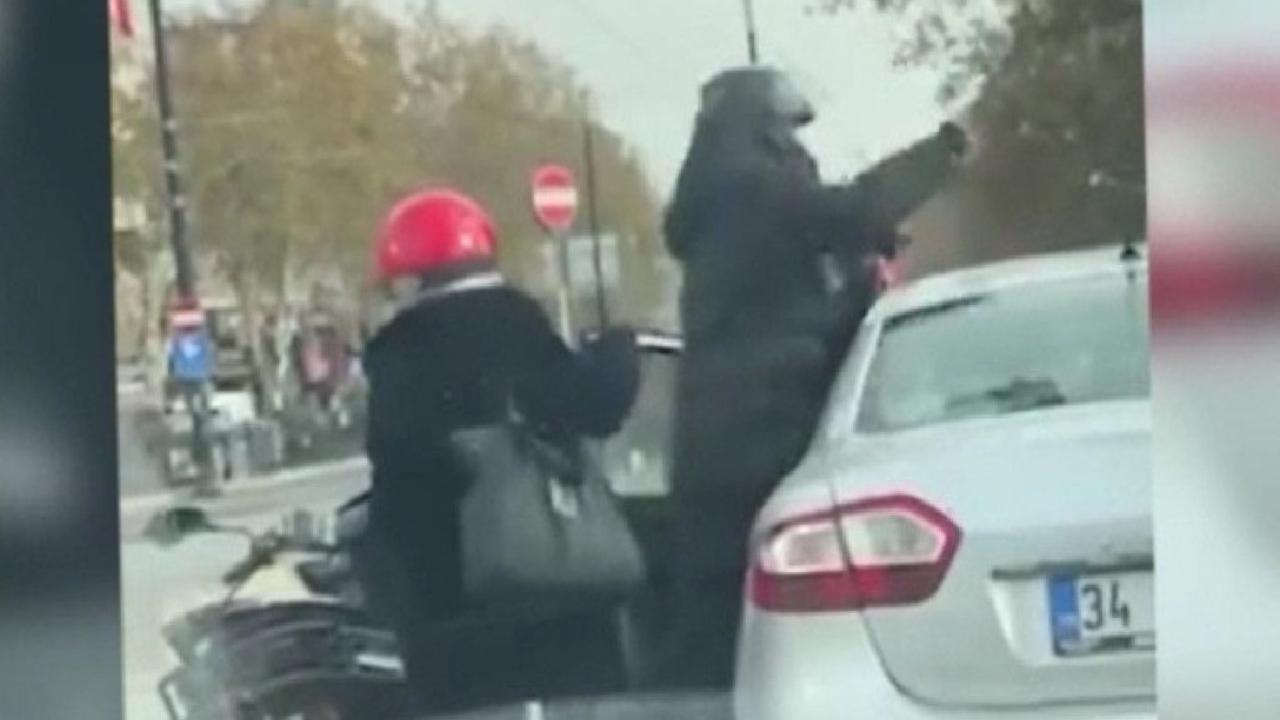 Tartışma sırasında motosiklet sürücüsü yan tarafında bulunan otomobilin kapısına birkaç kez tekme attı.