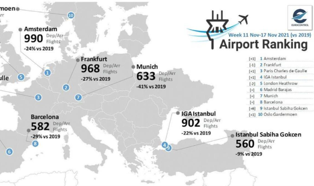 Frankfurt Havalimanı 968 seferle ikinci, Paris Charles de Gaulle Havalimanı 931 uçuşla üçüncü sıradaki yerini aldı.