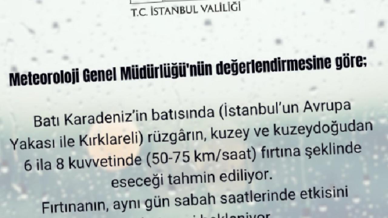 İSTANBUL () - İstanbul Valiliği, Meteoroloji Genel Müdürlüğü verilerine dayanarak Batı Karadeniz’in batısında kısa süreli fırtına beklendiğini duyurdu.